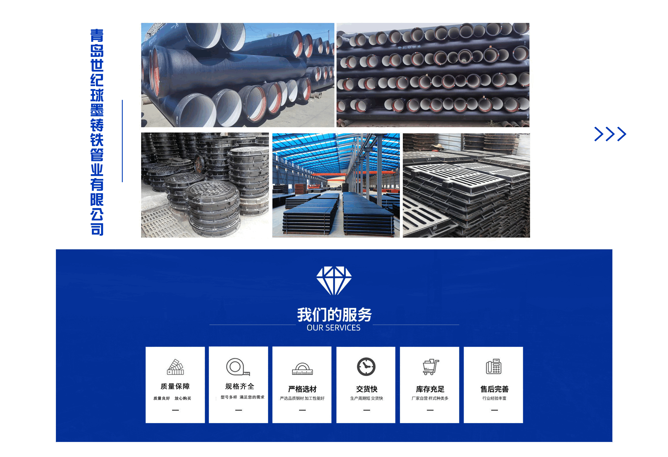 青島世紀球墨鑄鐵管業有限公司主營DN80mm~DN2600mm球墨鑄鐵管,給排水球墨鑄鐵管,球墨鑄鐵頂管,自錨式球墨鑄鐵管,球墨鑄鐵保溫管,球墨鑄鐵管件,柔性排水鑄鐵管,球墨鑄鐵井蓋,雨篦子等產品。我公司實力雄厚,常備萬噸庫存,貨源充足,規格齊全,發貨速度快!    青島世紀管業嚴格執行“精益求精,增強顧客滿意;精益求進,實現持續發展”的質量方針,建立起完善的售前咨詢、售中安裝、售后回訪服務體系,真誠地與用戶建立起長期密切合作關系。優異的產品和良好服務受到廣大用戶的青睞,是您值得尊敬和信賴的合作伙伴。   青島世紀球墨鑄鐵管業始終堅持“誠信立業,追求卓越,合作共贏,共同發展”,竭誠歡迎各界朋友來廠參觀指導,洽談業務。我們愿與您攜手共進,互惠雙贏,共創未來!...